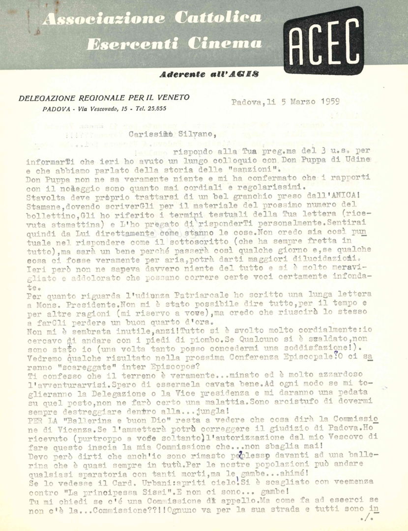 Don Massimiliano Dolzan aggiorna Silvano Battisti sulla situazione del circuito cinematografico cattolico del Veneto. Dattiloscritto