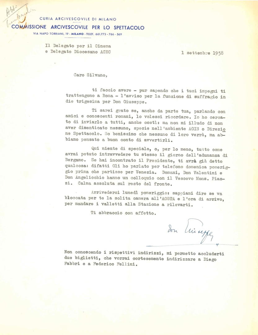 Lettera di don Giuseppe Sisti, delegato diocesano dell'ACEC e membro della Commissione arcivescovile per lo spettacolo di Milano, a Silvano Battisti, segretario generale dell'ACEC
