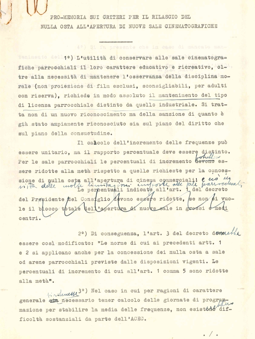Nota sulle licenze per l'apertura di sale cinematografiche parrocchiali. Dattiloscritto
