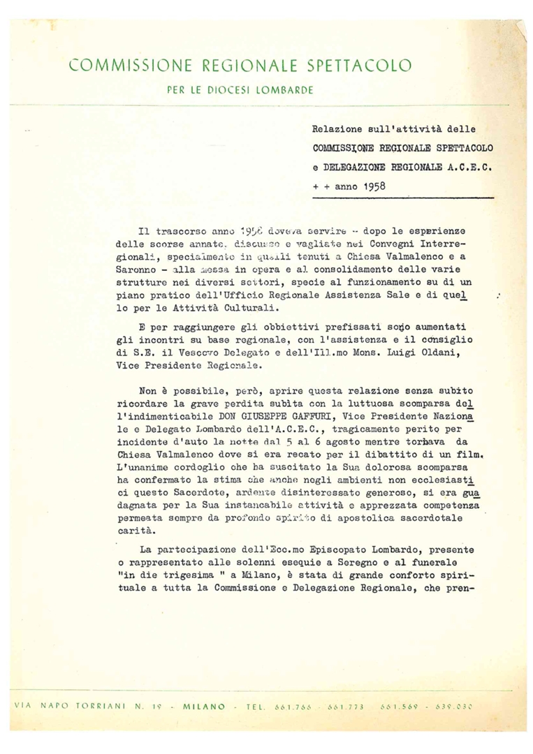 Relazione sull'attività della Commissione regionale spettacolo per le diocesi lombarde, anno 1958