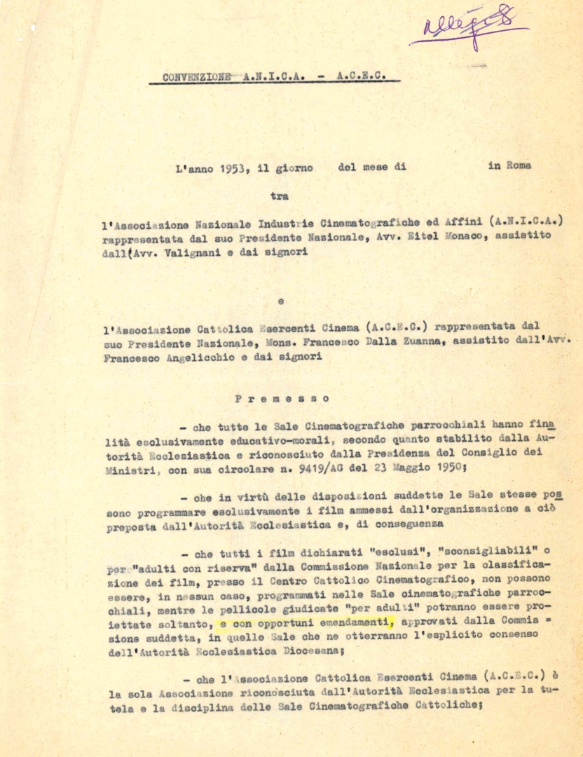 Testo degli accordi tra l'Associazione nazionale industrie cinematografiche ed affini - ANICA e l'ACEC. Dattiloscritto