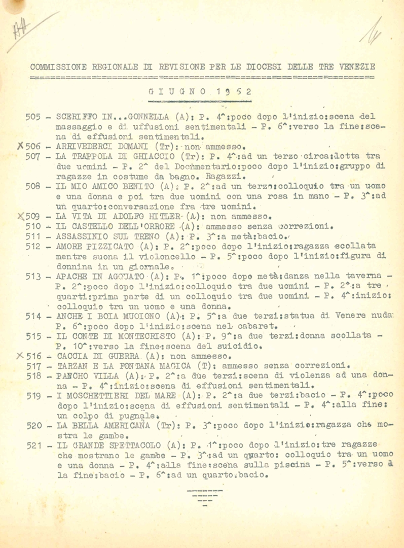 Classificazione di film a cura della Commissione regionale di revisione per le diocesi delle Tre Venezie, giugno 1962