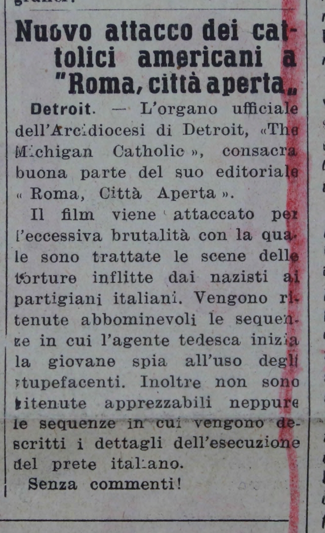 "Nuovo attacco dei cattolici americani a Roma città aperta"