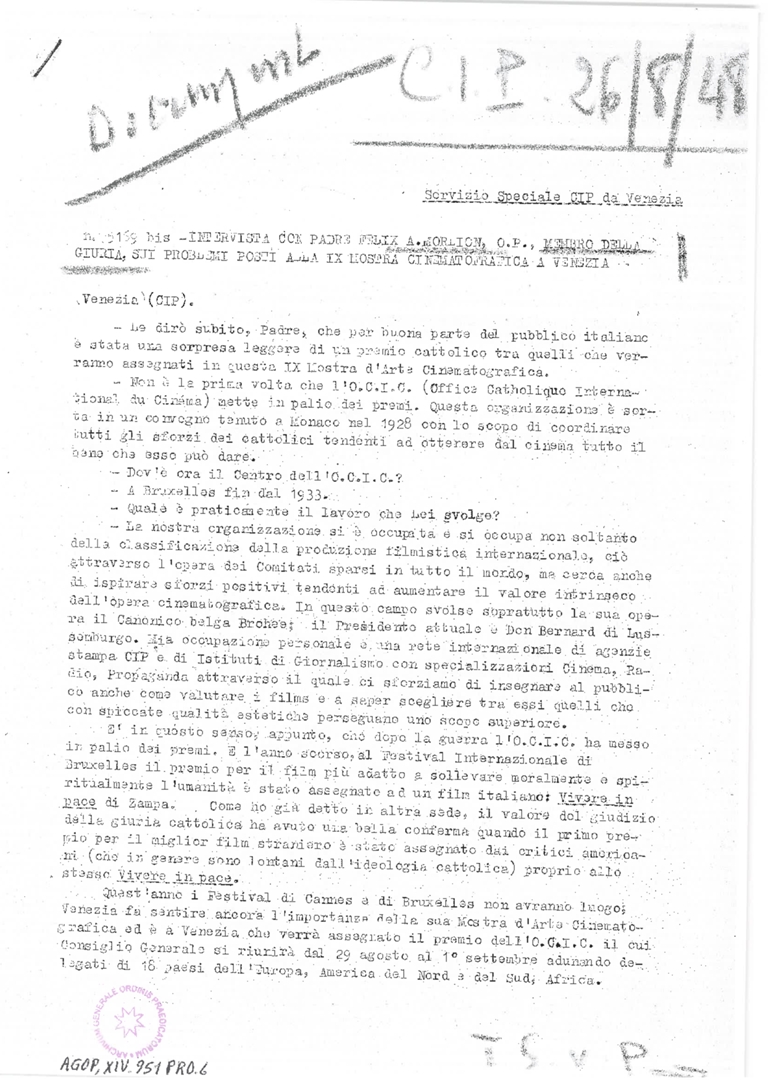"Intervista con padre Felix A. Morlion, o.p., membro della giuria, sui problemi posti alla IX mostra cinematografica a Venezia"