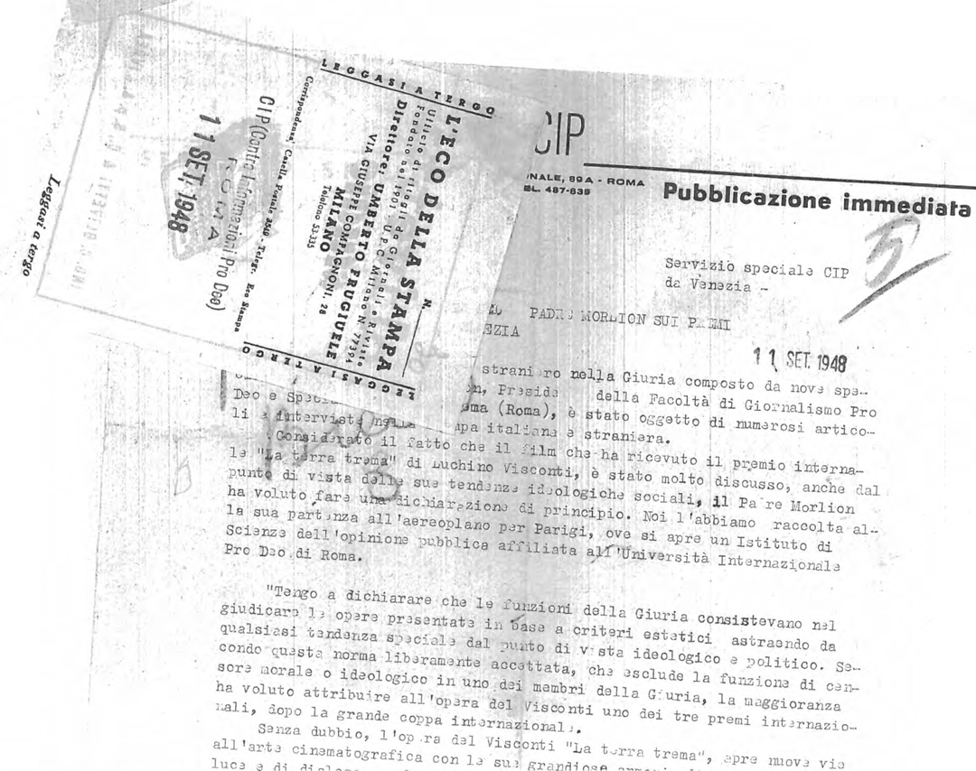 "Conclusioni di padre Morlion sui premi assegnati al festival di Venezia"