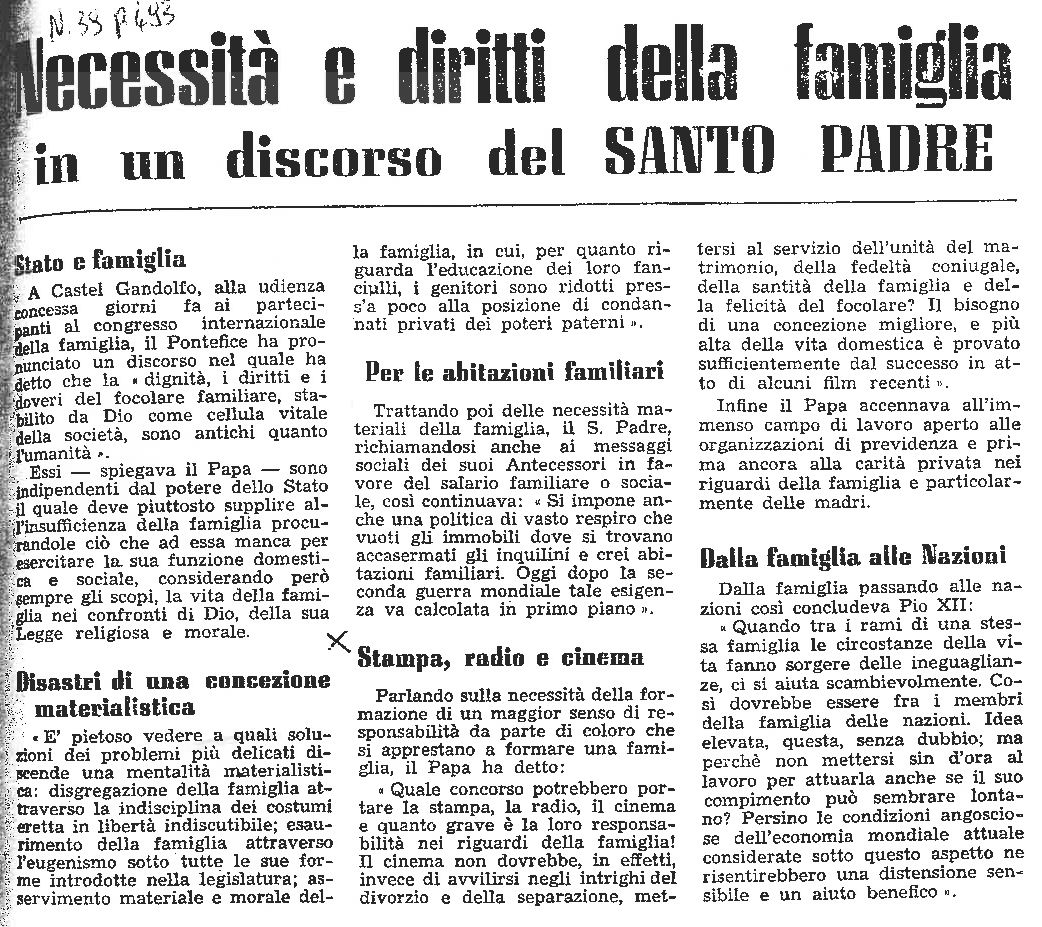 "Necessità e diritti della famiglia in un discorso del santo padre"