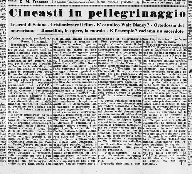 "Le armi di satana - Cristianizzare il film - È cattolico Walt Disney? - Ortodossia del neoverismo - Rossellini, le opere, la morale - E l'esempio? esclama un sacerdote"