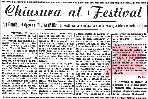 "La Ronde di Ophüls e Terra di Dio di Rossellini concludono la grande rassegna internazionale del film"