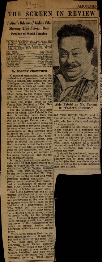 "Father's dilemma, italian film starring Aldo Fabrizi, new feature at word theatre"