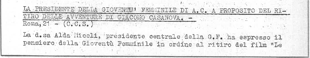"La presidente della gioventù femminile di A.C. a proposito del ritiro delle Avventure di Casanova"