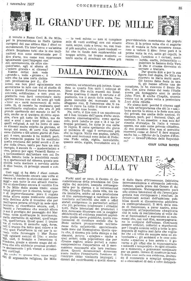 | Film (keywords PRIN 2012) | Cabiria (Giovanni Pastrone) Gli ultimi giorni di Pompei (Mario Caserini, Eleuterio Rodolfi) Limelight (Le luci della ribalta, Charlie Chaplin) The Greatest Show on Earth (Il più grande spettacolo del mondo, Cecil B. DeMille) The Sign of the Cross (Il segno della Croce, Cecil B. DeMille) The Ten Commandments (I dieci comandamenti, 1923, Cecil B. DeMille) |