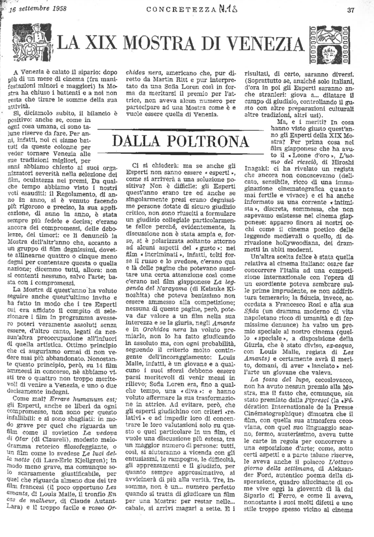 | Film (keywords PRIN 2012) | En cas de malheur (La ragazza del peccato, Claude Autant-Lara) God's Little Acre (Il piccolo campo di Dio, Anthony Mann) La sfida (Francesco Rosi) Les amants (Gli amanti, Louis Malle) Muhomatsu No Issho (L'uomo del risciò, Hiroshi Inagaki) Narayama bushiko (La leggenda di Narayama, Keisuke Kinoshita) Nattens Ljus (Luci della notte, Lars-Eric Kjellgren) Otarova vdova (La vedova di Otar, Michail Ediserovic Ciaureli) The Black Orchid (Orchidea nera, Martin Ritt) Une vie (Una vita, Alexandre Astruc) Vlci jama (La tana del lupo, Jiří Weiss) Ósmy dzien tygodnia (L'ottavo giorno della settimana, Alexander Ford) |