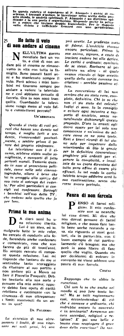 "In questa rubrica si espongono al p. Atanasio i dubbi di coscienza, i travagli dell'animo, le incertezze nella scelta della propria strada, le ansietà spirituali. P. Atanasio è un direttore spirituale e la sua posta è segretissima. Risponde anche in privato a coloro che inviano doppio francobollo. Per le risposte sulla rivista è sufficiente firmarsi con uno pseudonimo"