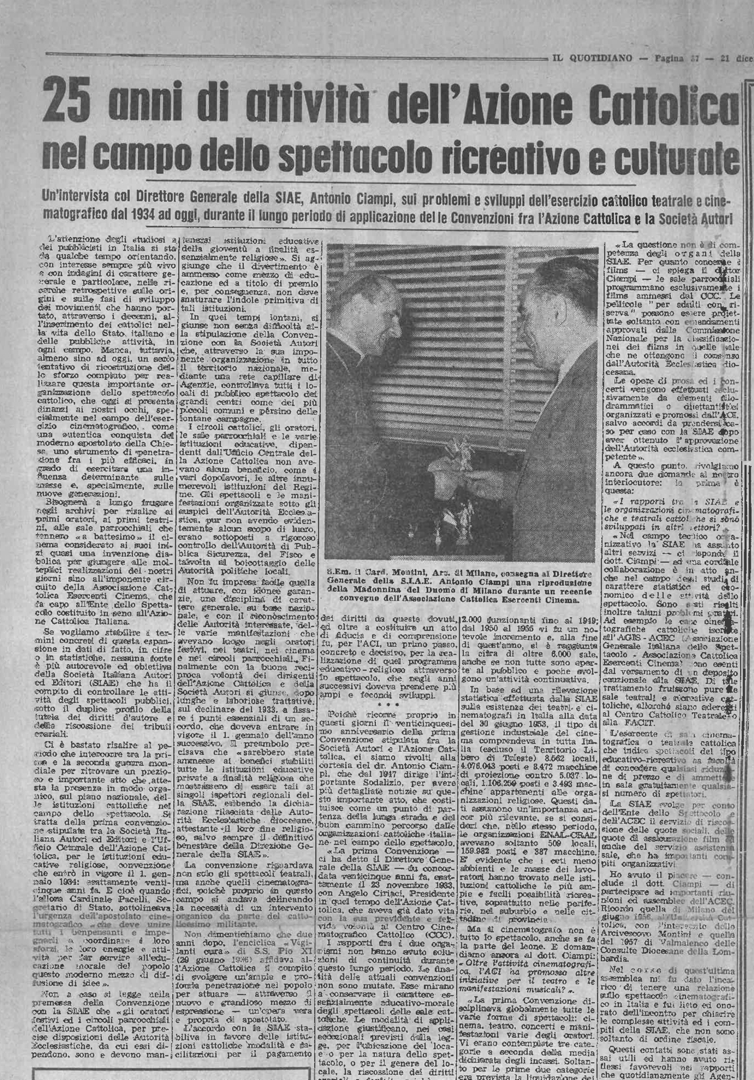"Un'intervista col direttore generale della SIAE, Antonio Ciampi, sui problemi e sviluppi dell'esercizio cattolico teatrale e cinematografico dal 1934 ad oggi, durante il lungo periodo di applicazione delle convenzioni fra l'Azione Cattolica e la Società Autori"