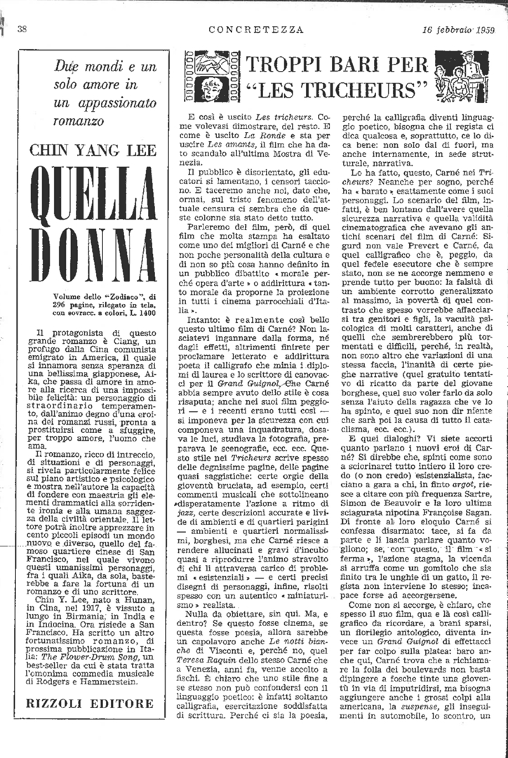 | Film (keywords PRIN 2012) | La ronde (Il piacere e l'amore, Max Ophüls) Le notti bianche (Luchino Visconti) Les amants (Gli amanti, Louis Malle) Les tricheurs (Peccatori in blue-jeans, Marcel Carné) Thérèse Raquin (Teresa Raquin, Marcel Carné) |