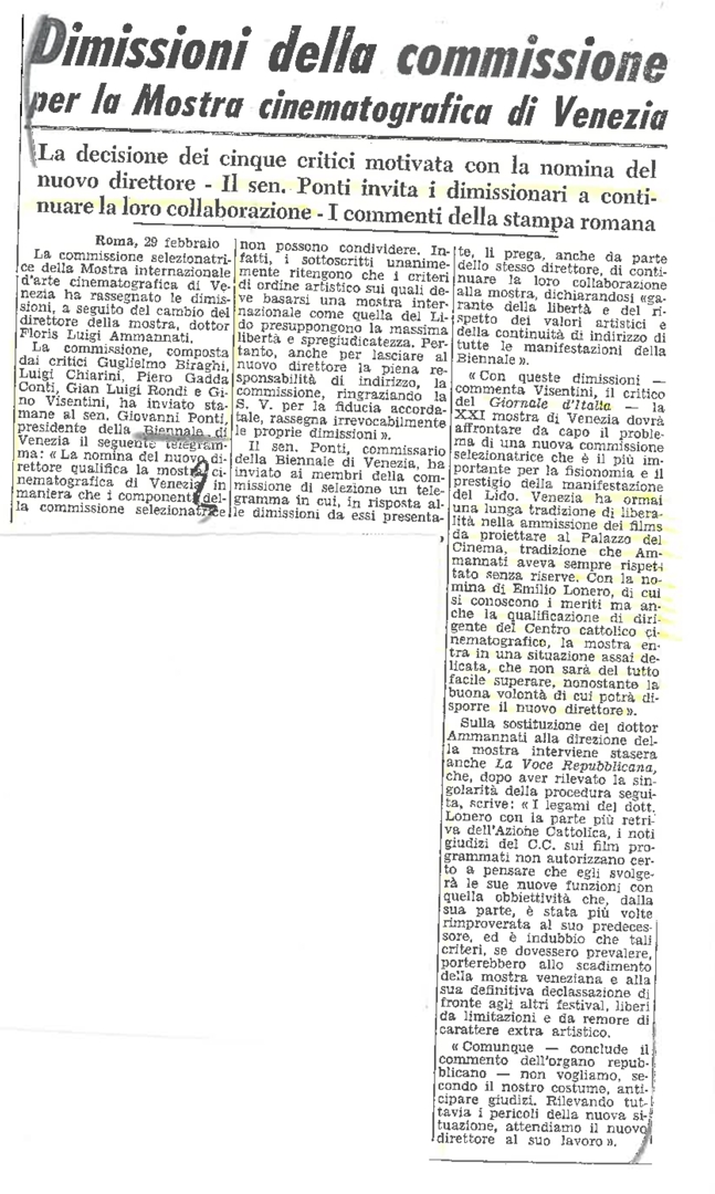 "La decisione dei cinque critici motivata con la nomina del nuovo direttore. Il sen. Ponti invita i dimissionari a continuare la loro collaborazione. I commenti della stampa romana"