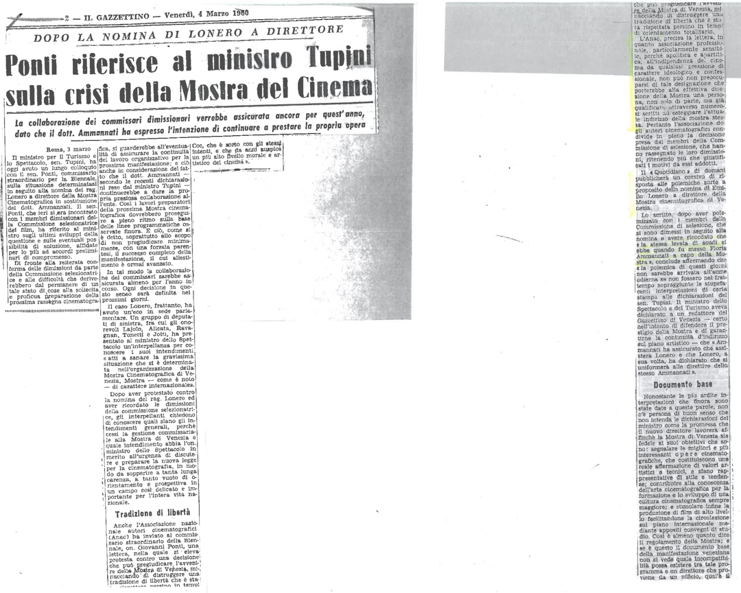 "Ponti riferisce al ministro Tupini sulla crisi della mostra del cinema"