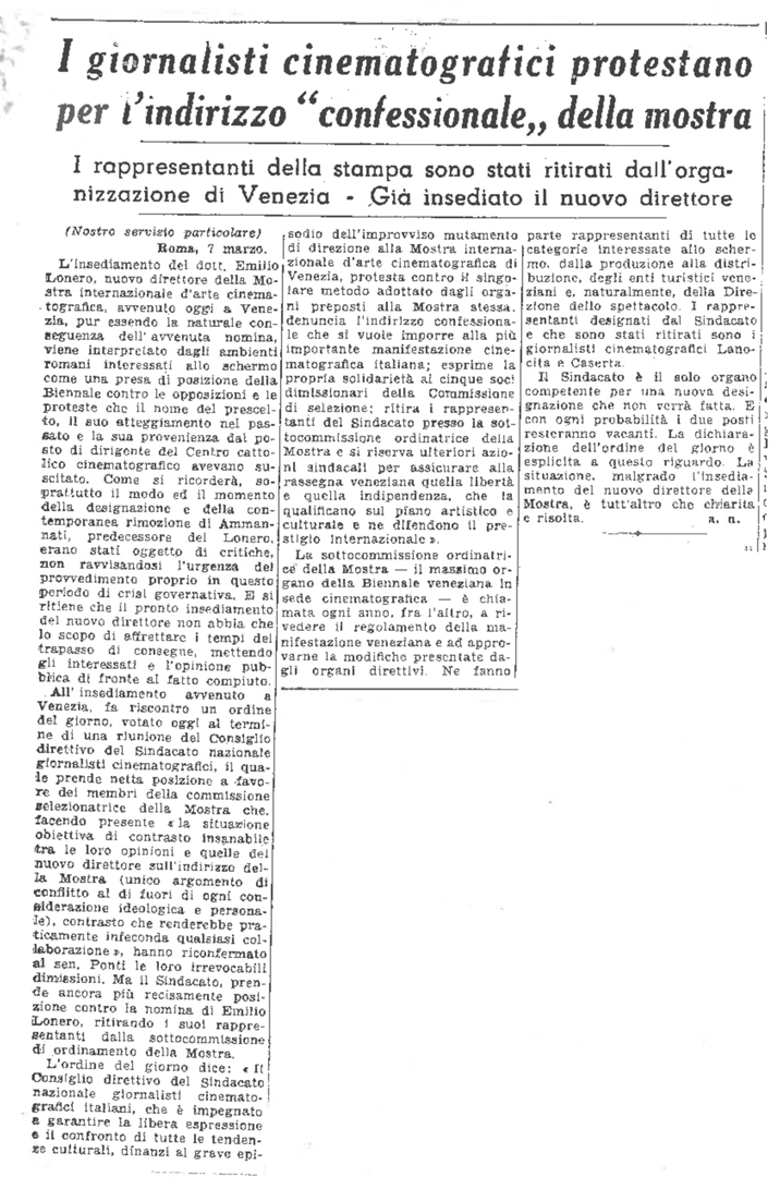 "I giornalisti cinematografici protestano per l'indirizzo confessionale della mostra"