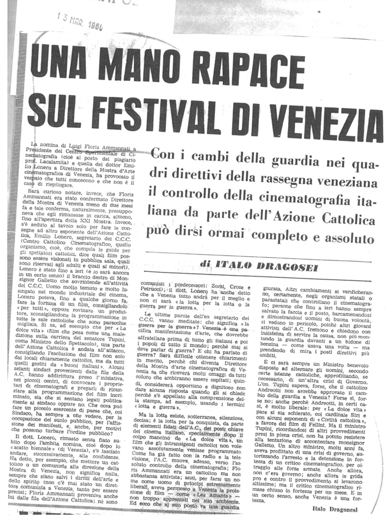 "Con i cambi della guardia nei quadri direttivi della rassegna veneziana il controllo della cinematografia italiana da parte dell'Azione Cattolica può dirsi ormai completo e assoluto"