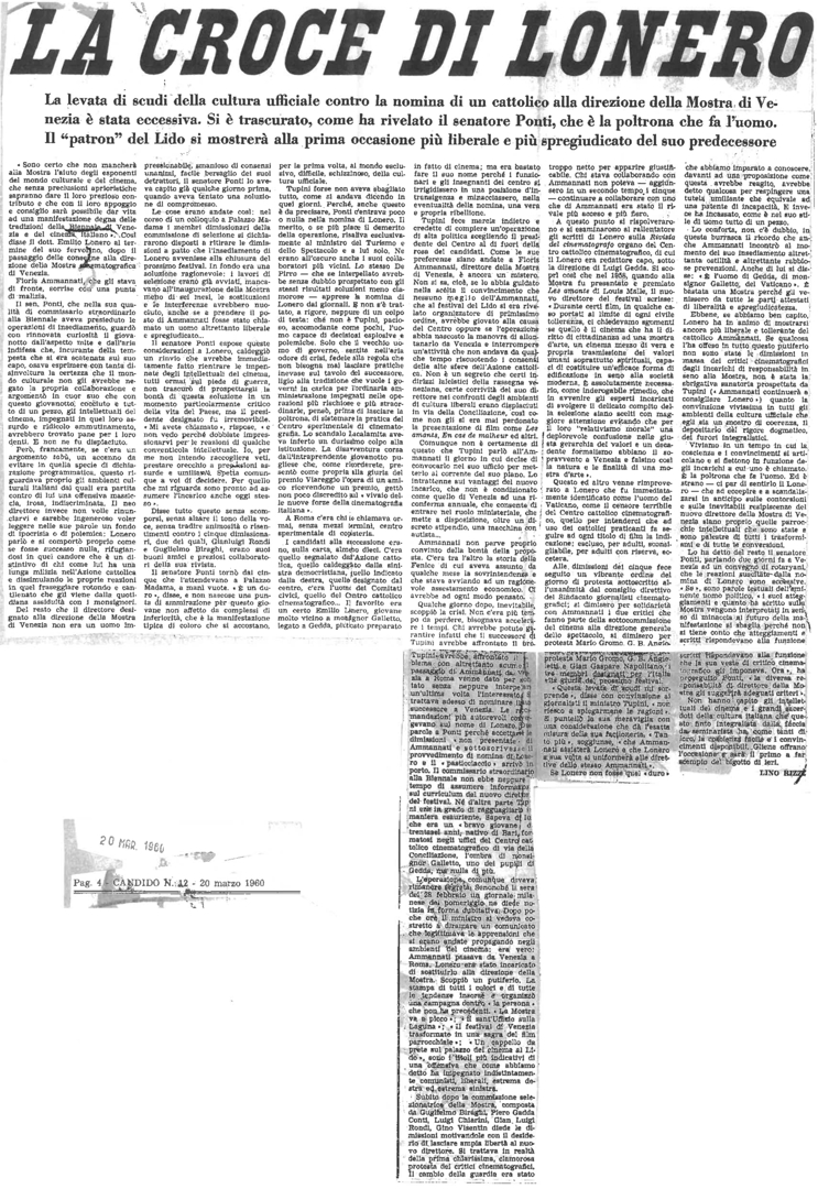 "La levata di scudi della cultura ufficiale contro la nomina di un cattolico alla direzione della mostra di Venezia è stata eccessiva. Si è trascurato, come ha rivelato il senatore Ponti, che è la poltrona che fa l'uomo. Il patron del Lido si mostrerà alla prima occasione più liberale e più spregiudicato del suo predecessore"