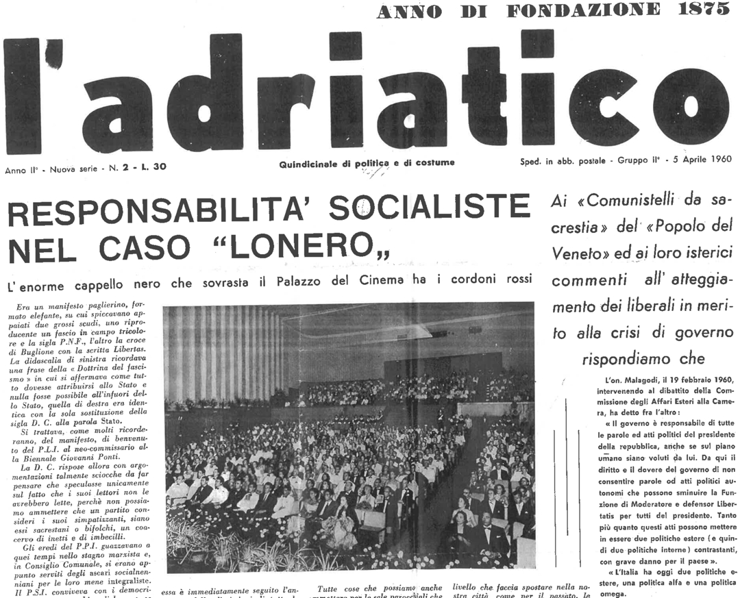 "L'enorme cappello nero che sovrasta il palazzo del cinema ha i cordoni rossi"