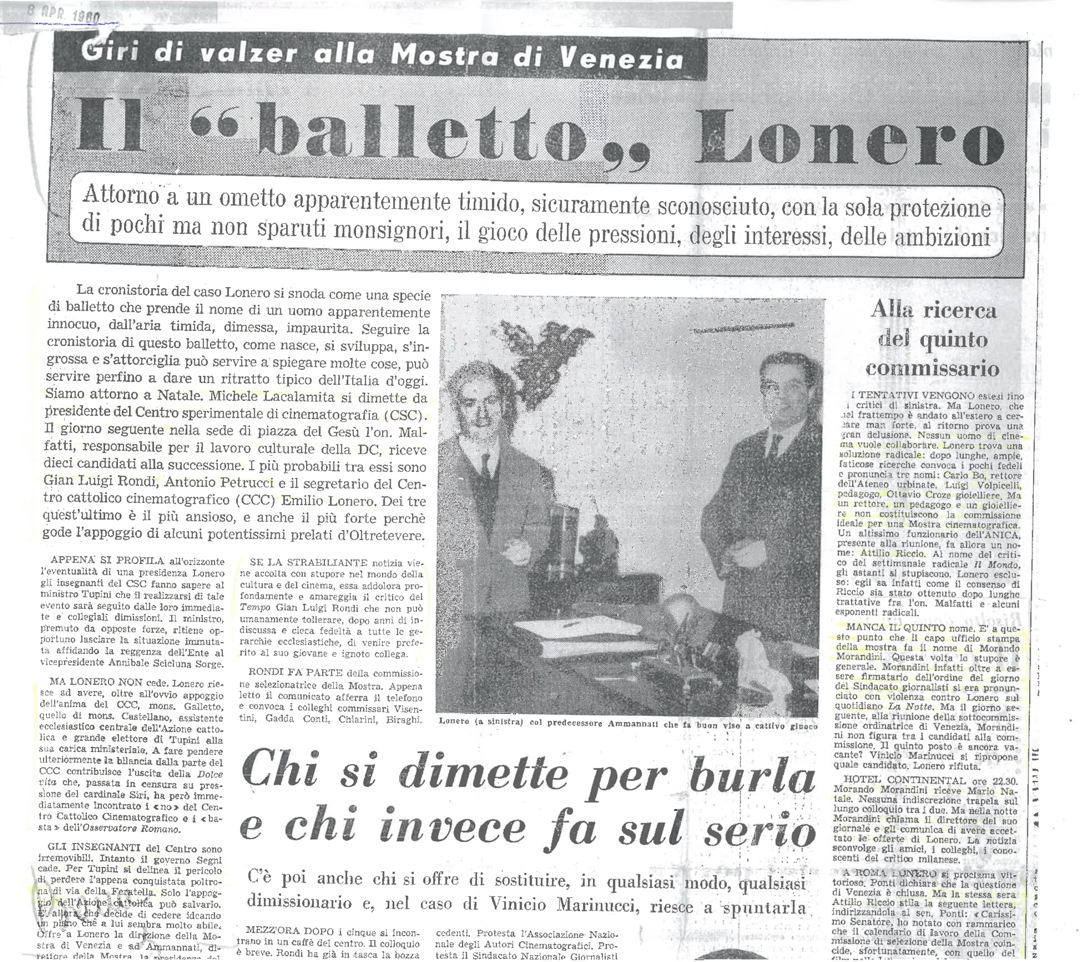 | Temi (keywords PRIN 2012) | ACI (Azione Cattolica Italiana) Albino Galletto Antonio Petrucci CCC (Centro Cattolico Cinematografico) CSC (Centro Sperimentale di Cinematografia) DC (Democrazia Cristiana) Emilio Lonero Gian Luigi Rondi Giuseppe Siri L'Osservatore Romano Morando Morandini Mostra Internazionale del Cinema di Venezia Paolo Valmarana Rivista del Cinematografo Umberto Tupini XXI Mostra Internazionale del Cinema di Venezia editoria e stampa cattolica |