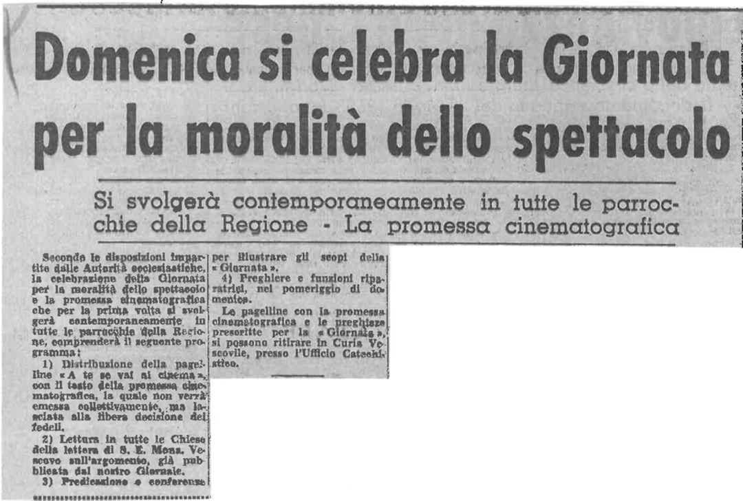 "Domenica si celebra la giornata per la moralità dello spettacolo"
