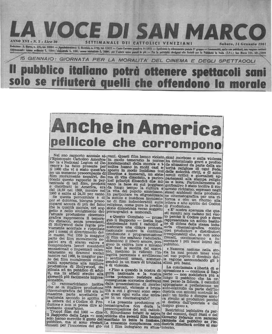 | Temi (keywords PRIN 2012) | Giornata per la moralità dello spettacolo e del cinema (15 gennaio 1961) Legion of Decency cinema immorale matrimonio e divorzio osceno |