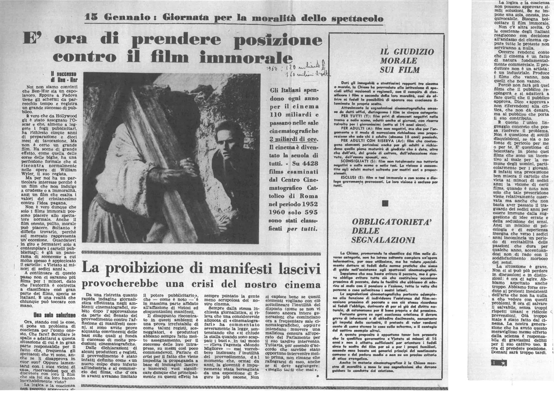 | Temi (keywords PRIN 2012) | Giornata per la moralità dello spettacolo e del cinema (15 gennaio 1961) cinema immorale legislazione in difesa della moralità manifesti, trailer e pubblicità del film osceno pubblicità immorale revisione cinematografica |