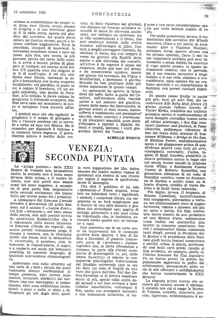 | Film (keywords PRIN 2012) | Bridge to the Sun (Ponte verso il sole, Étienne Périer) Il Giudizio Universale (Vittorio De Sica) Il brigante (Renato Castellani) Kde řeky mají slunce (Il giorno in cui l'albero fiorirà, Václav Krska) L'Année dernière à Marienbad (L'anno scorso a Marienbad, Alain Resnais) Myr Vchodjashchcemu (Pace a chi entra, Aleksandr Alov e Vladimir Naumov) Summer and Smoke (Estate e fumo, Tennessee Williams) Tu ne tueras point (Non uccidere, Claude Autant-Lara) Vanina Vanini (Roberto Rossellini) Victim (La vittima, Basil Dearden) |
