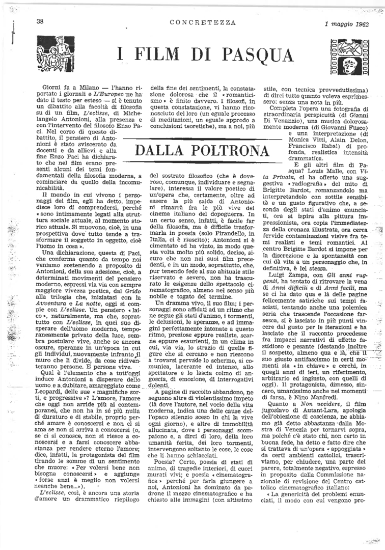 | Film (keywords PRIN 2012) | Anni difficili (Luigi Zampa) Anni facili (Luigi Zampa) Gli anni ruggenti (Luigi Zampa) L'avventura (Michelangelo Antonioni) L'eclisse (Michelangelo Antonioni) La notte (Michelangelo Antonioni) Tu ne tueras point (Non uccidere, Claude Autant-Lara) Vie privée (Vita privata, Louis Malle) |