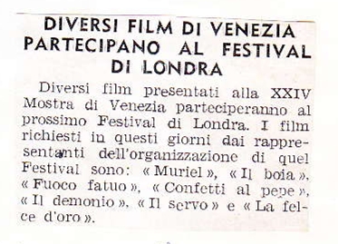 | Film (keywords PRIN 2012) | Dragées au poivre (Confetti al pepe, Jacques Baratier) El verdugo (La ballata del boia, Luis García Berlanga) Il demonio (Brunello Rondi) Le feu follet (Fuoco fatuo, Louis Malle) Muriel (Muriel, il tempo di un ritorno, Alain Resnais) The Servant (Il servo, Joseph Losey) Zlaté kapradi (Jiri Weiss) |