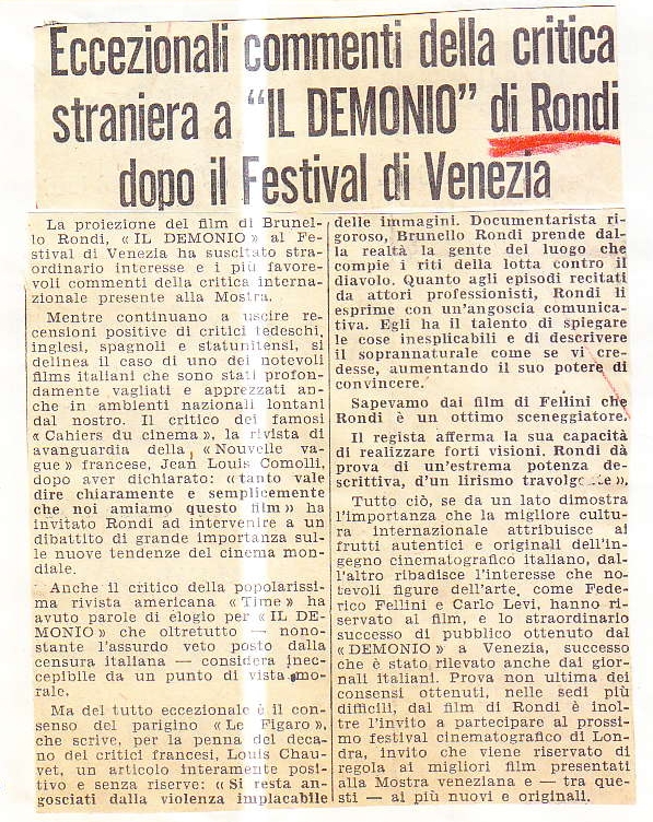 "Eccezionali commenti dalla critica straniera a il demonio di Rondi dopo il festival di Venezia"