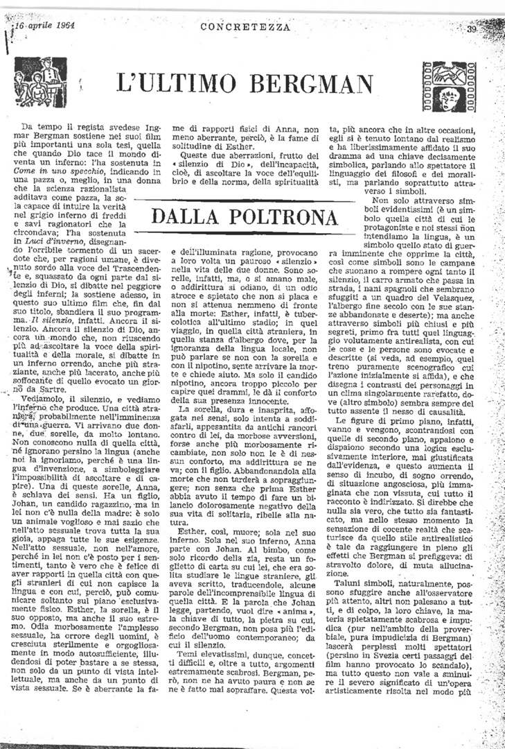| Film (keywords PRIN 2012) | Nattvardsgästerna (Luci d'inverno, Ingmar Bergman) Sasom i en spegel (Come in uno specchio, Ingmar Bergman) Tystnaden (Il silenzio, Ingmar Bergman) |