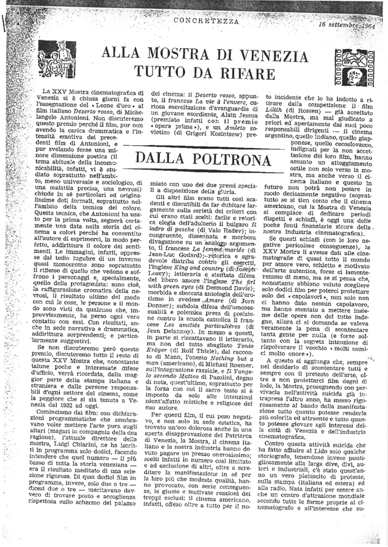 Film (keywords PRIN 2012) | Att älska (Amare, Jörn Donner) Gamlet (Amleto, Grigori Kozintsev) Il Vangelo secondo Matteo (Pier Paolo Pasolini) Il deserto rosso (Michelangelo Antonioni) King and Country (Per il re e per la patria, Joseph Losey) Kradecat na praskovi (Il ladro di pesche, Valo Radev) La vie à l'envers (Una vita alla rovescia, Alain Jessua) Les Amitiés particulières (Le amicizie particolari, Jean Delannoy) Nothing But a Man (Michael Roemer) Tonio Kröger (Rolf Thiele) Une femme mariée (Una donna sposata, Jean-Luc Godard) |