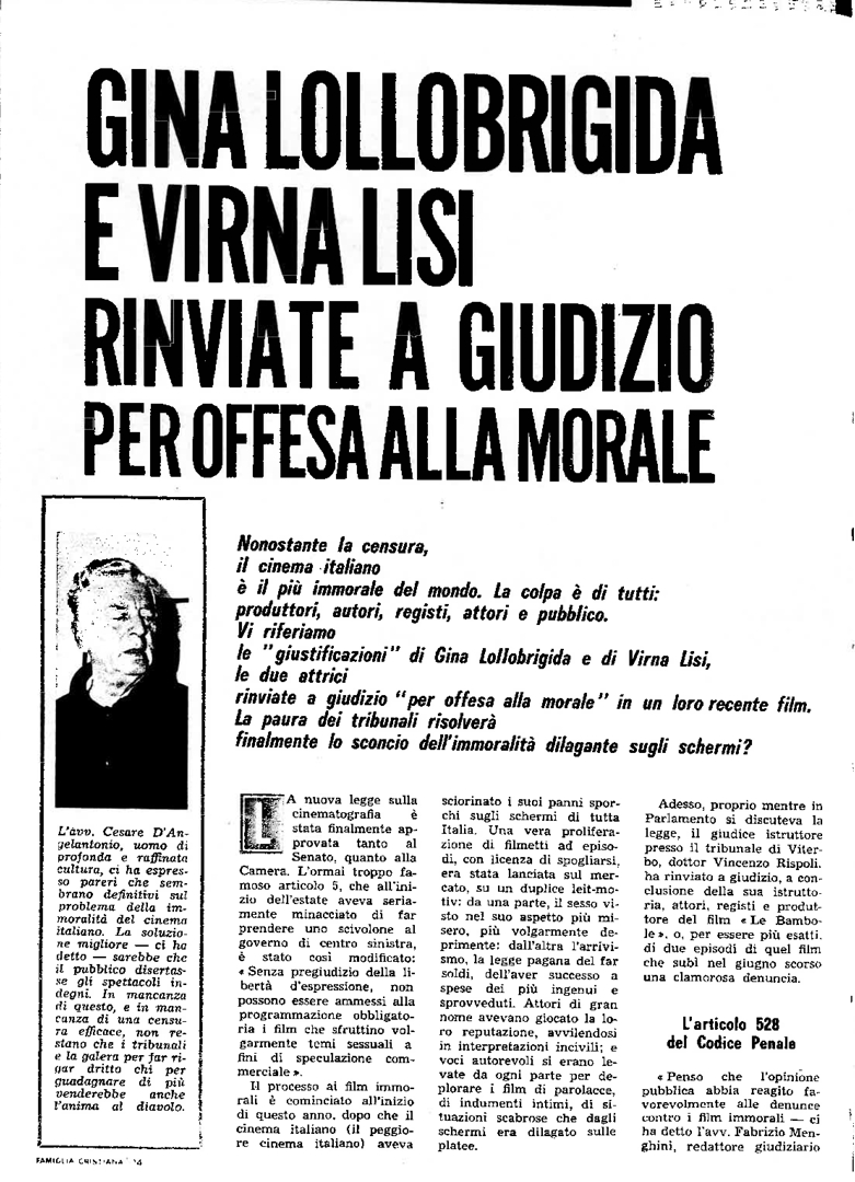 "Gina Lollobrigida e Virna Lisi rinviate a giudizio per offesa alla morale"