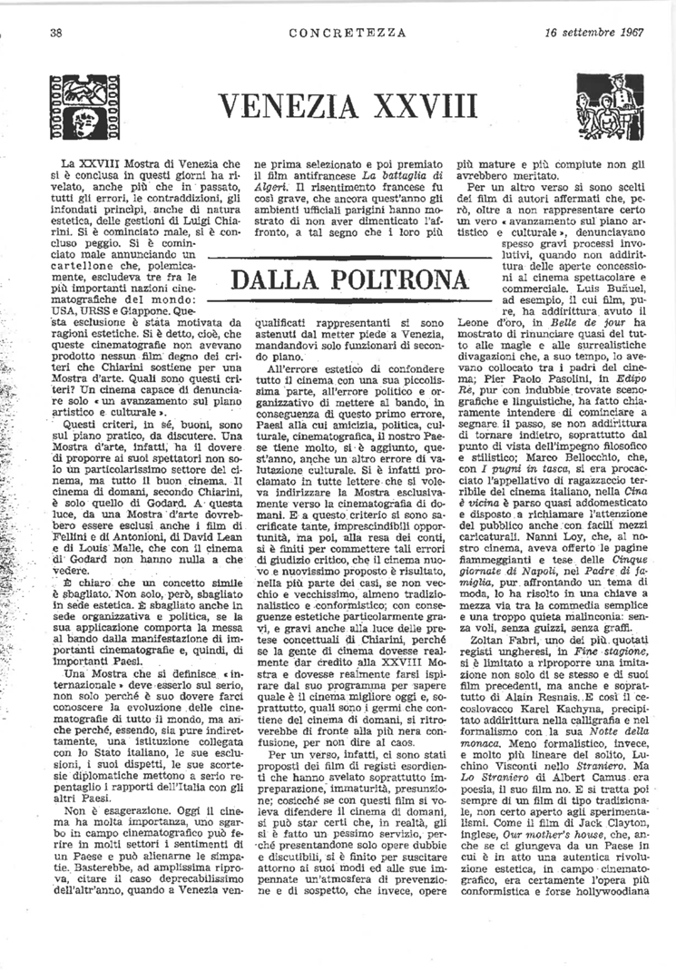 | Film (keywords PRIN 2012) | Belle de jour (Bella di giorno, Luis Buñuel) Edipo re (Pier Paolo Pasolini) I pugni in tasca (Marco Bellocchio) Il padre di famiglia (Nanni Loy) La Cina è vicina (Marco Bellocchio) La battaglia di Algeri (Gillo Pontecorvo) Le quattro giornate di Napoli (Nanni Loy) Lo straniero (Luchino Visconti) Noc nevesti (La notte della monaca, Karel Kachyna) Our Mother's House (Tutte le sere alle nove, Jack Clayton) Utószezon (Fuori stagione, Zoltán Fábri) |