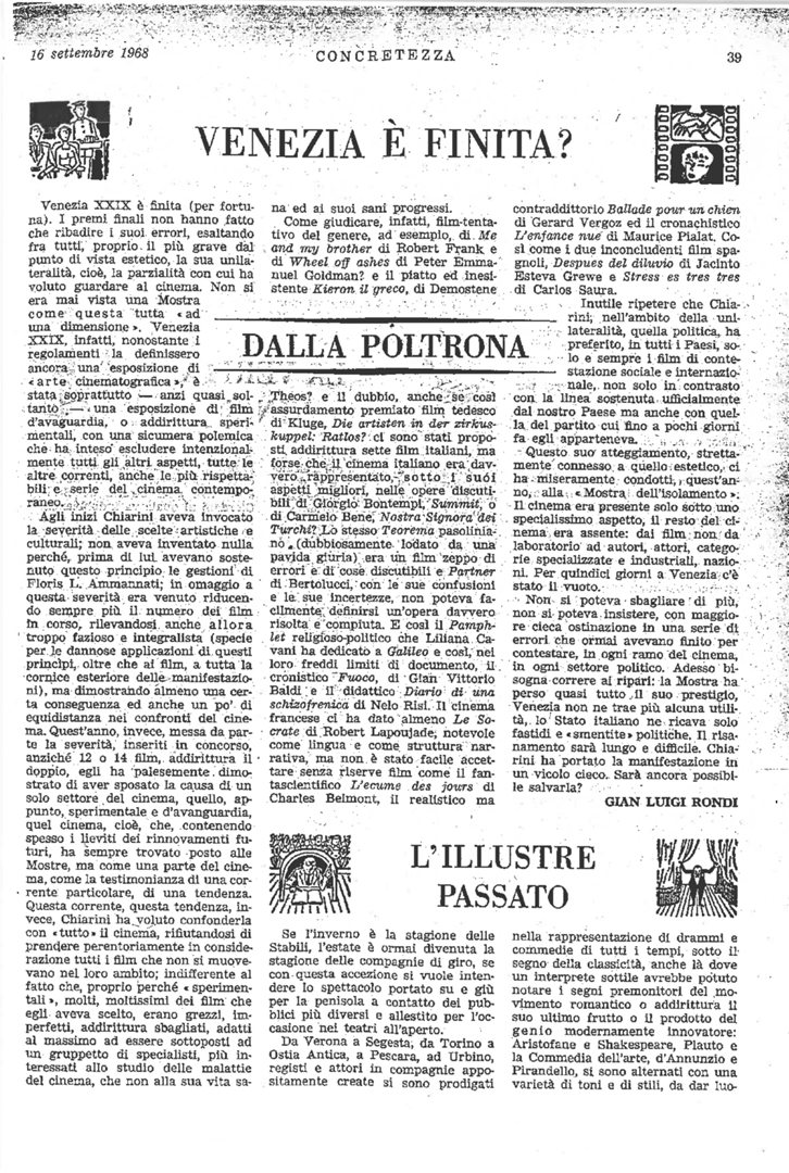| Film (keywords PRIN 2012) | Ballade pour un chien (Gérard Vergez) Después del diluvio (Jacinto Esteva) Diario di una schizofrenica (Nelo Risi) Die Artisten in der Zirkuskuppel: Ratlos (Artisti sotto la tenda del circo: perplessi, Alexander Kluge) Fuoco! (Gian Vittorio Baldi) Galileo (Liliana Cavani) L'enfance nue (Maurice Pialat) L'écume des jours (La schiuma dei giorni, Charles Belmont) Le Socrate (Il Socrate, Robert Lapoujade) Me and My Brother (Robert Frank) Nostra Signora dei Turchi (Carmelo Bene) Partner (Bernardo Bertolucci) Stress-es tres-tres (Lo stress è tre, Tre, Carlos Saura) Summit (Giorgio Bontempi) Teorema (Pier Paolo Pasolini) Wheel of Ashes (Peter Emanuel Goldman) |