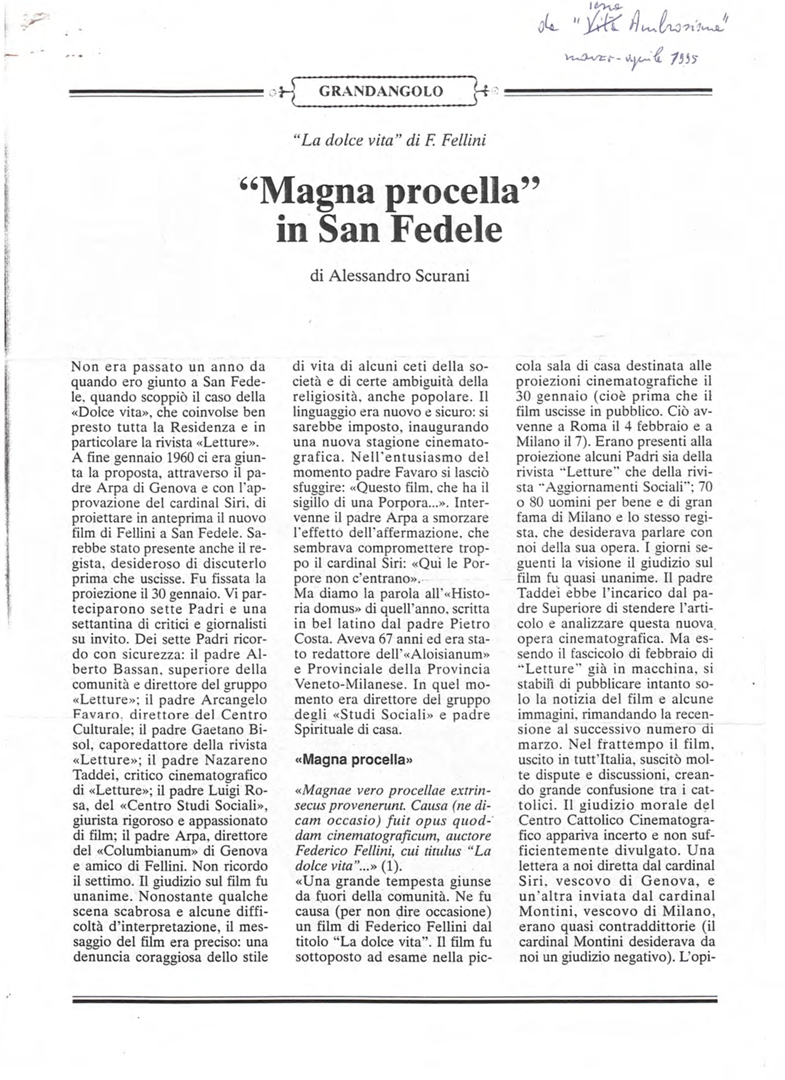 | Temi (keywords PRIN 2012) | Angelo Arpa CCC (Centro Cattolico Cinematografico) Centro Culturale San Fedele (Milano) Federico Fellini Gian Luigi Rondi Giovanni Battista Montini Giuseppe Dalla Torre Giuseppe Siri L'Osservatore Romano Letture Nazareno Taddei Pier Paolo Pasolini Schedario cinematografico cinema immorale coscienza storica editoria e stampa cattolica gesuiti provvedimenti disciplinari revisione cinematografica |