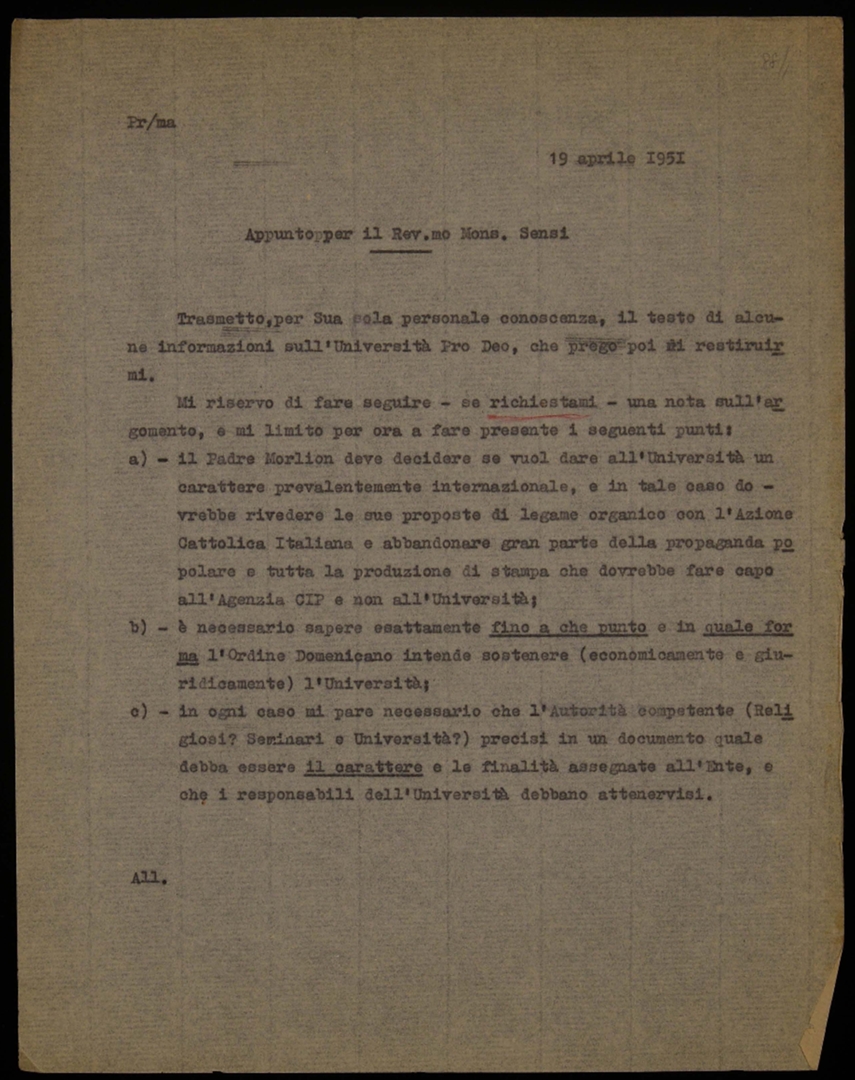 Invio di informazioni sull'Università internazionale Pro Deo: carattere, finalità, rapporti con l'Ordine domenicano. Dattiloscritto