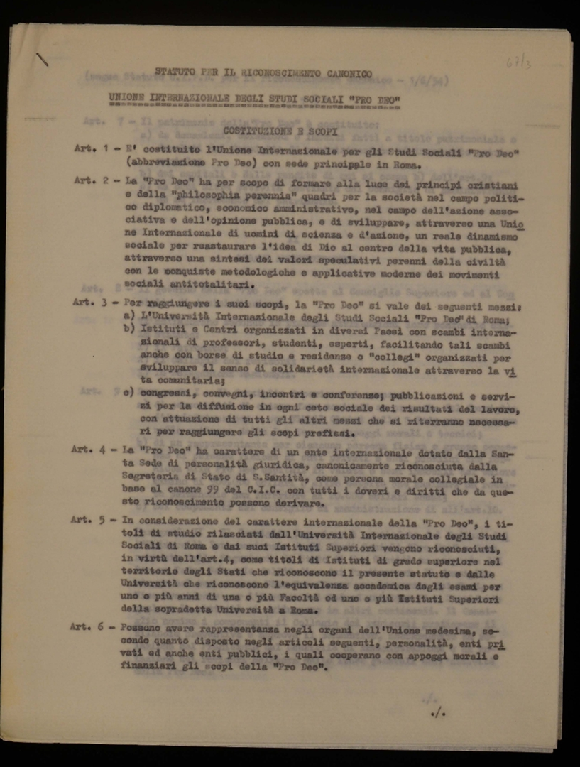 Statuto dell'Unione internazionale Pro Deo: costituzione, scopi, organi amministrativi. Dattiloscritto