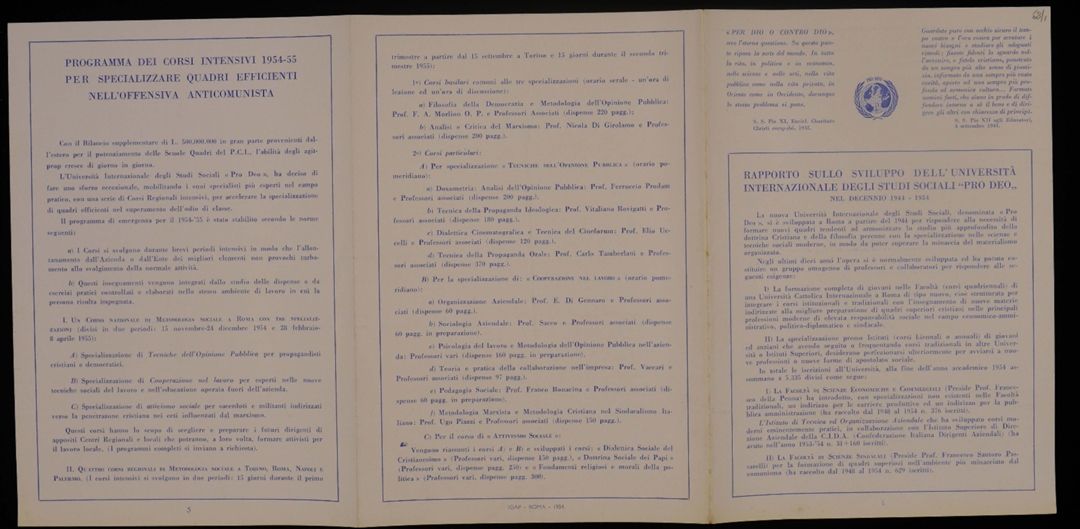 "Programma dei corsi intensivi 1954-55 per specializzare quadri efficienti nell'offensiva anticomunista"