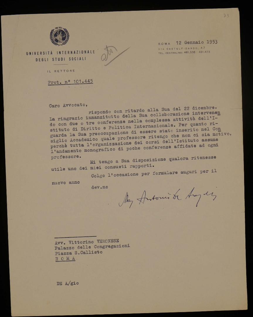 Lettera di padre Félix Morlion, rettore dell'Università internazionale di studi sociali, a Vittorino Veronese