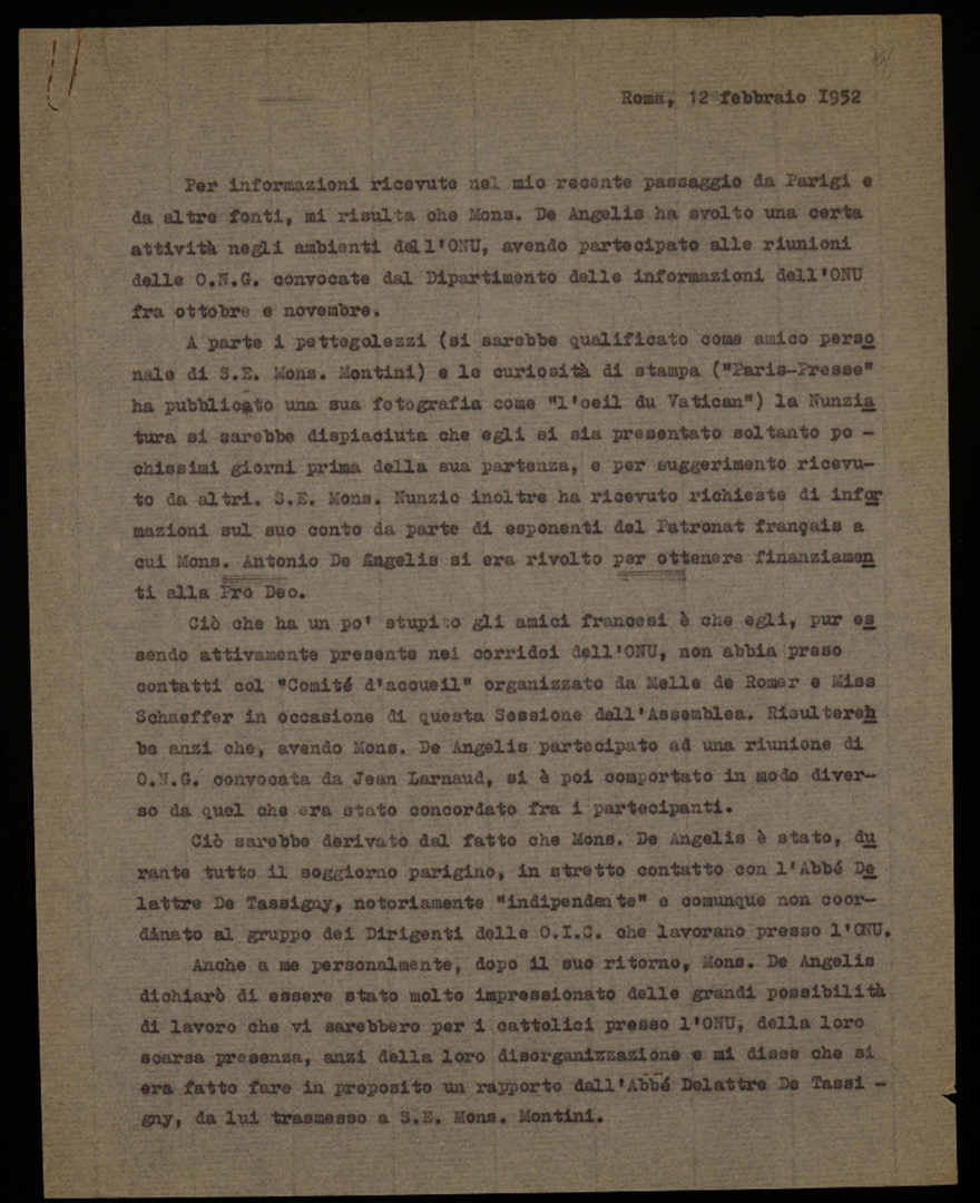 Rapporto su mons. De Angelis e sulle sue iniziative in ambiente internazionale a proposito dei finanziamenti all'organizzazione Pro Deo. Dattiloscritto