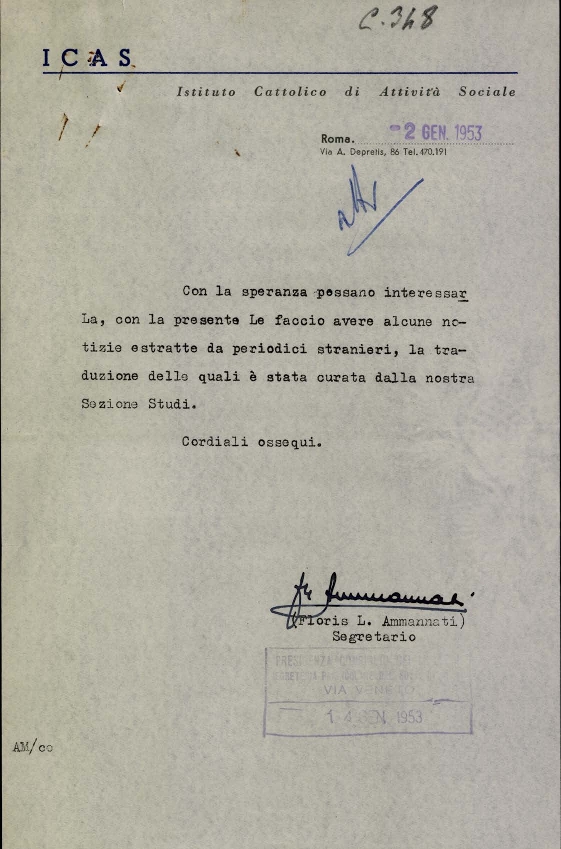 Lettera di Floris Luigi Ammannati, segretario dell'Istituto cattolico di attività sociale - ICAS, a destinatario non indicato