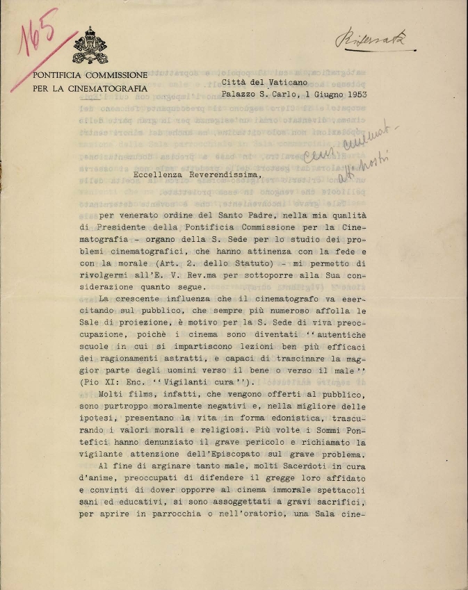 Lettera di mons. Martin John O'Connor, presidente della Pontificia commissione per la cinematografia didattica e religiosa, e di mons. Albino Galletto, segretario esecutivo della Commissione, a destinatario non indicato