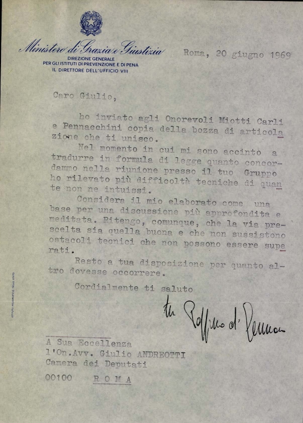 Con lettera di trasmissione a firma di Giuseppe Di Gennaro, direttore dell'ufficio VII della direzione generale per gli istituti di prevenzione e di pena, all'on. Giulio Andreotti. Dattiloscritto