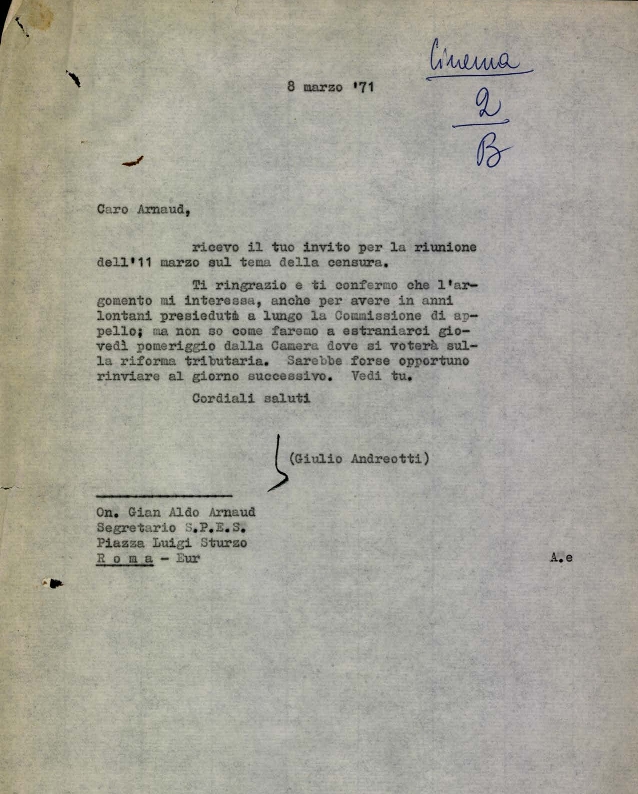 Giulio Andreotti risponde a Gian Aldo Arnaud chiedendo un rinvio della riunione sulla censura. Dattiloscritto