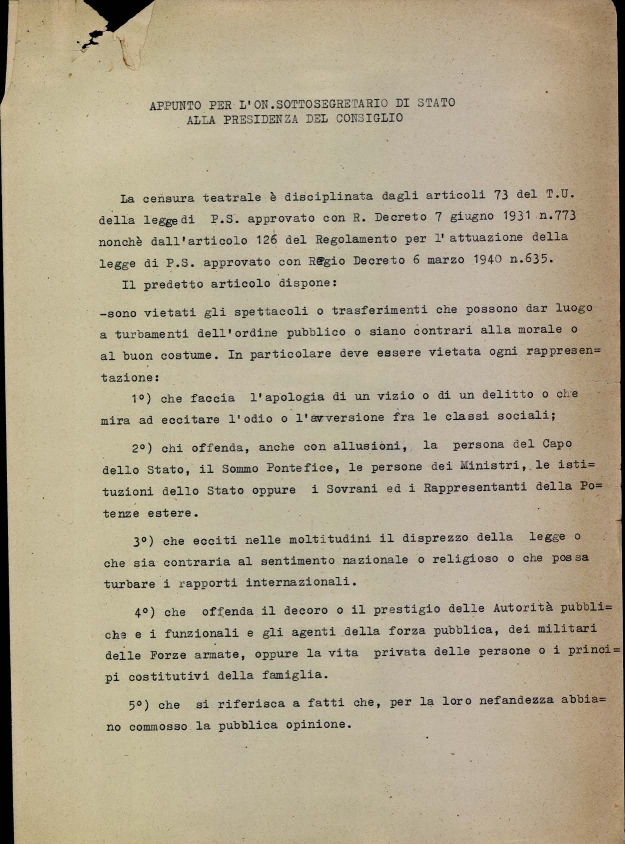 "Appunto per l'on. sottosegretario di Stato alla presidenza del consiglio", a firma del capo della censura teatrale Gaspare Franco