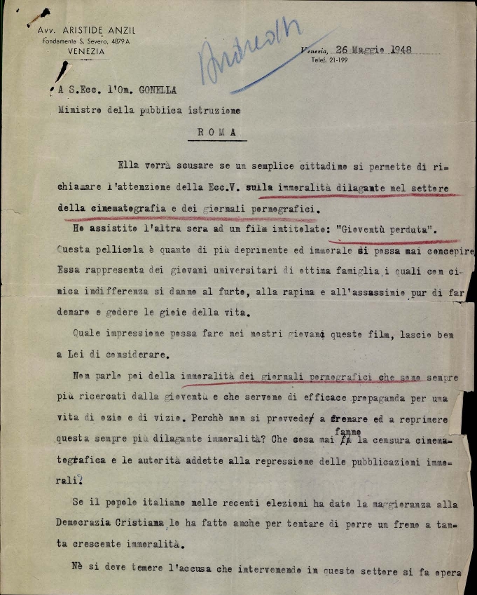 Aristide Anzil segnala a Guido Gonella l'immoralità dilagante nel settore della cinematografia e della stampa pornografica. Dattiloscritto